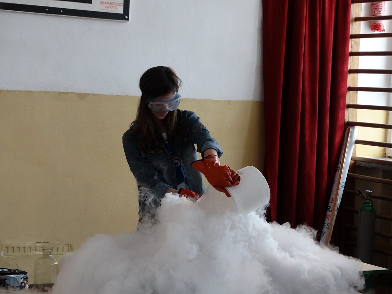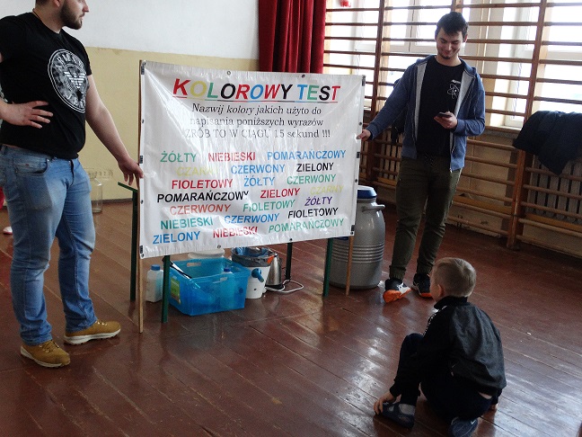 Nie mogło zabraknąć podczas pokazu ciekłego azotu, który w połączeniu z gorącą wodą wytworzył białą chmurę. Na koniec tych niesamowitości Panowie zaproponowali „Kolorowy Test”, lecz niestety nikomu nie udało się go rozwiązać w wymaganym czasie. Grupie „ Zaelektryzowani” bardzo dziękujemy za przyjemnie spędzony czas oraz atrakcyjne treści i eksperymenty. Zapraszamy ponownie!!!