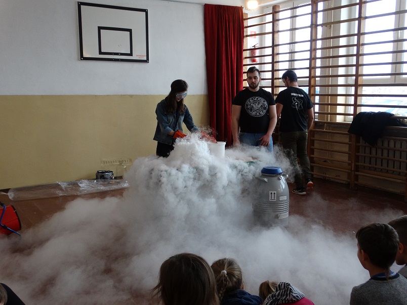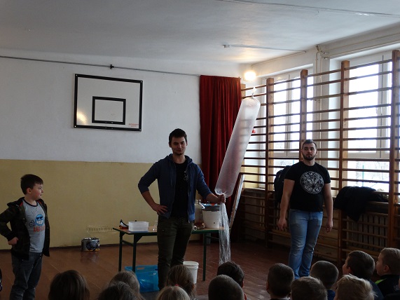 „Edukacja w niekonwencjonalny sposób” – takie motto przyświeca grupie „Zaelektryzowani”, specjalizującej się w interaktywnych spektaklach naukowych. Z pokazem „Fizyka wszędzie styka” odwiedzili uczniów naszej szkoły.W efektowny sposób przedstawili doświadczenia z fizyki i chemii. Na początku pokazali, jak szybko można nadmuchać rękaw do pieczenia mięsa. Wyczarowali okręgi z dymu, które puszczane w stronę widowni były ochoczo łapane.