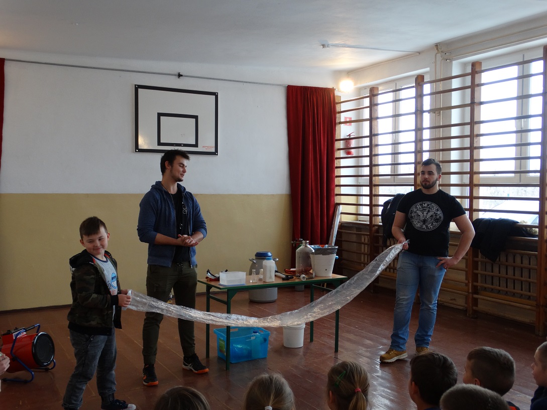Zmiana głosu również nie była problemem po wdychaniu helu. Oliwia i Bartek rozbawili wszystkich swoim „nowym” głosem. Po krótkim wykładzie na temat wodoru w szkole rozległ się niesamowity huk – był to wybuch balonika napełnionego H2.