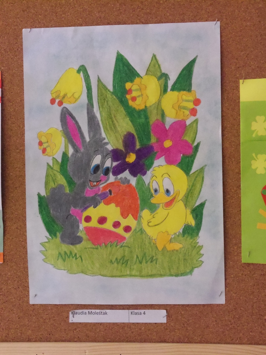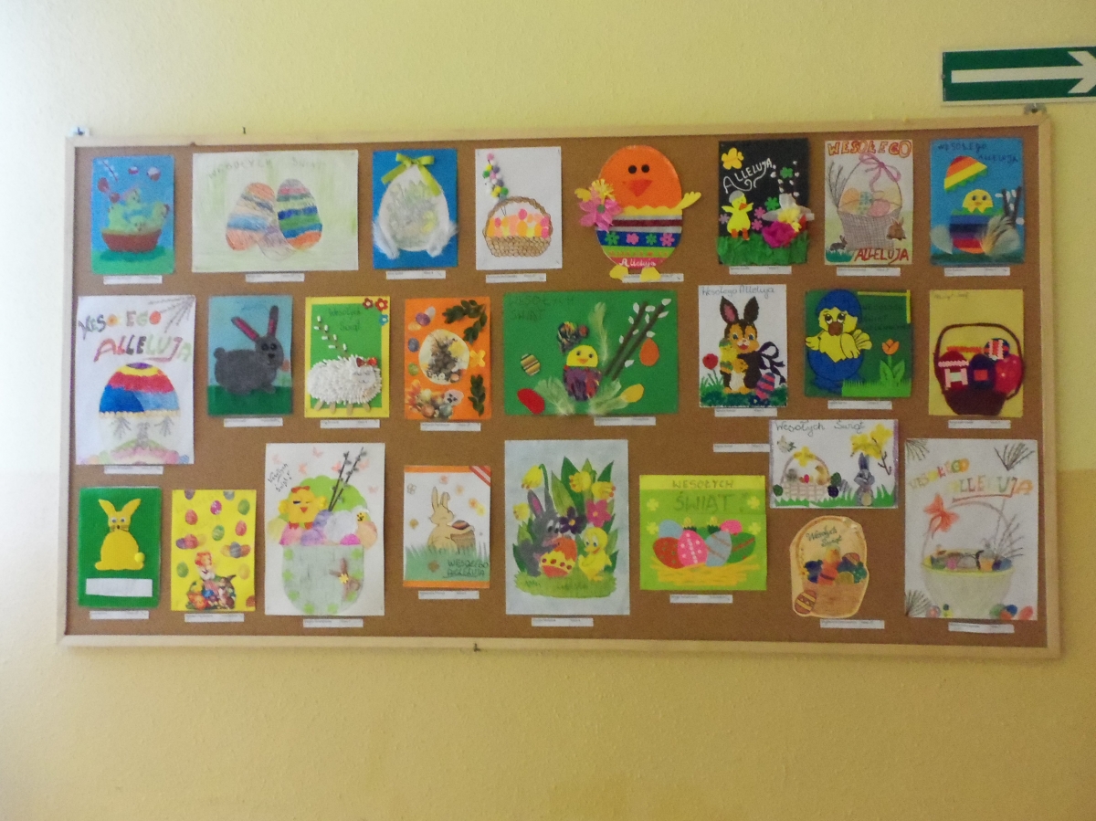 W kwietniu został przeprowadzony w naszej szkole konkurs plastyczny na najładniejszą kartkę wielkanocną, wykonaną dowolną techniką. W konkursie mogły wziąć udział dzieci z przedszkola i oddziału przedszkolnego oraz uczniowie klas I-VI. Zadaniem uczestników konkursu było przedstawienie własnej wizji, nastroju oraz tradycji Wielkanocy w postaci kartki świątecznej. Liczba prac zgłoszona do konkursu nie była zbyt wielka, ale poziom prac okazał się imponujący. Komisja konkursowa, złożona aż z ośmiu osób miała nie lada zadanie, aby wybrać najładniejsze prace. Ostatecznie zdecydowano, że: