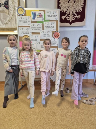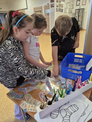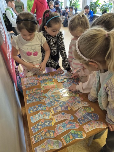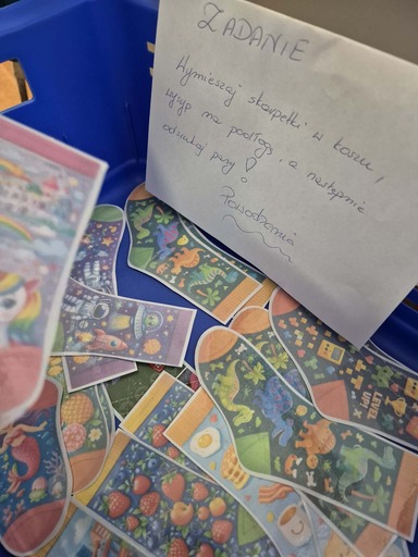 Przygotowano również pudełko, w którym znajdowało się 160 kolorowych, wzorzystych skarpetek wykonanych z kartonu. Zadaniem uczniów było dobranie skarpetek w pary. Okazało się to nie lada wyzwaniem, które wymagało cierpliwości, spostrzegawczości wzrokowej oraz umiejętności współpracy w grupie. Zabawa cieszyła się dużym zainteresowaniem i zaangażowaniem uczniów.