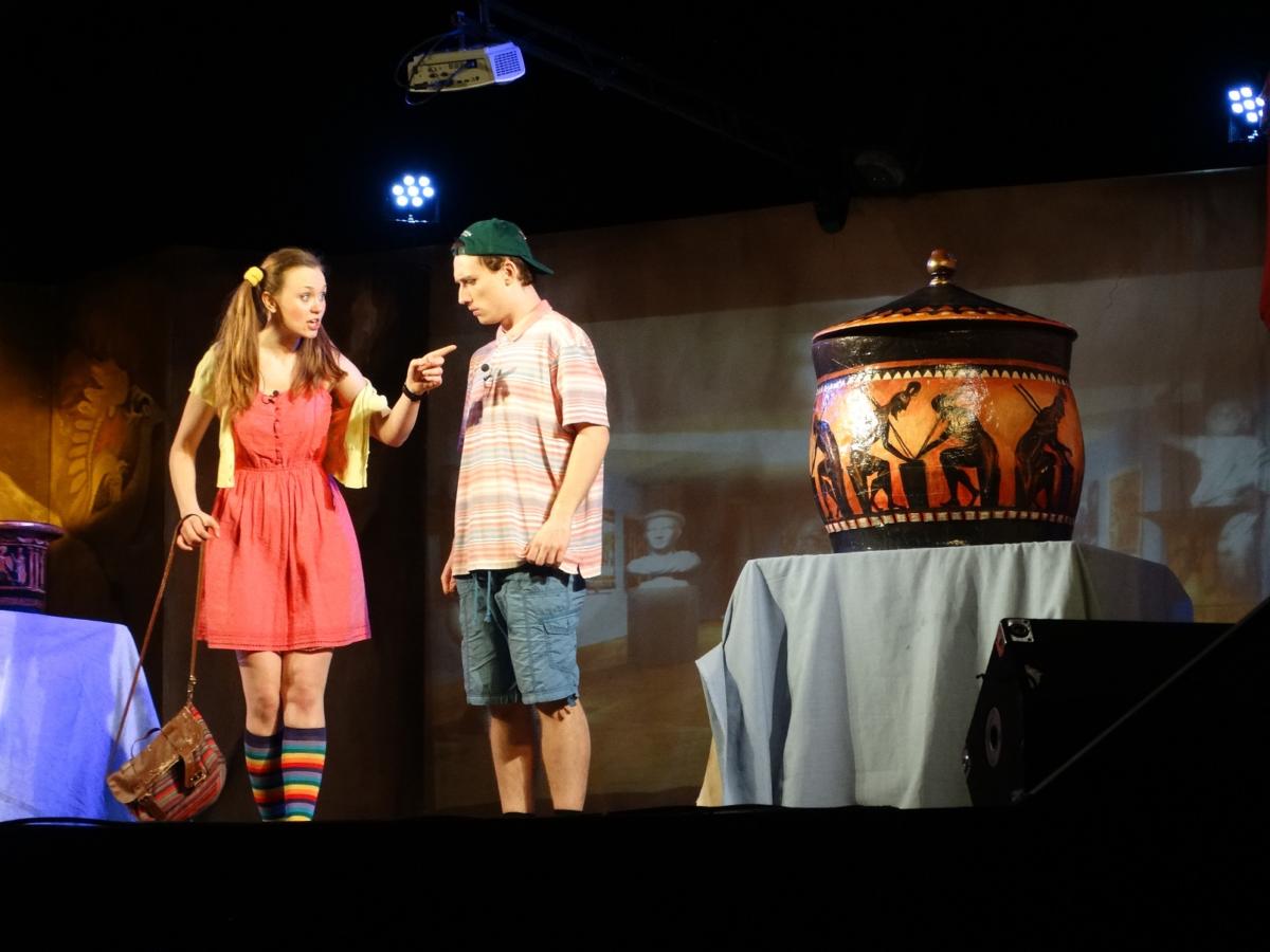 Spektakl opowiadał o historii rodzeństwa Oli i Michała, którzy zgubili się w muzeum. Ola nieświadomie otworzyła puszkę Pandory, z której wydostało się zło, przez co rozgniewała Zeusa. Później za karę musieli zrobić nić Ariadny z czterech żywiołów, które musieli znaleźć. Przy szukaniu wody, powietrza, ziemi i ognia Ola i Michał spotykali różne mitologiczne postacie. Historia zakończyła się szczęśliwie, ponieważ rodzeństwo znalazło cztery żywioły i zło znowu zostało zamknięte w puszce Pandory, a dzieci wróciły do rzeczywistego świata.