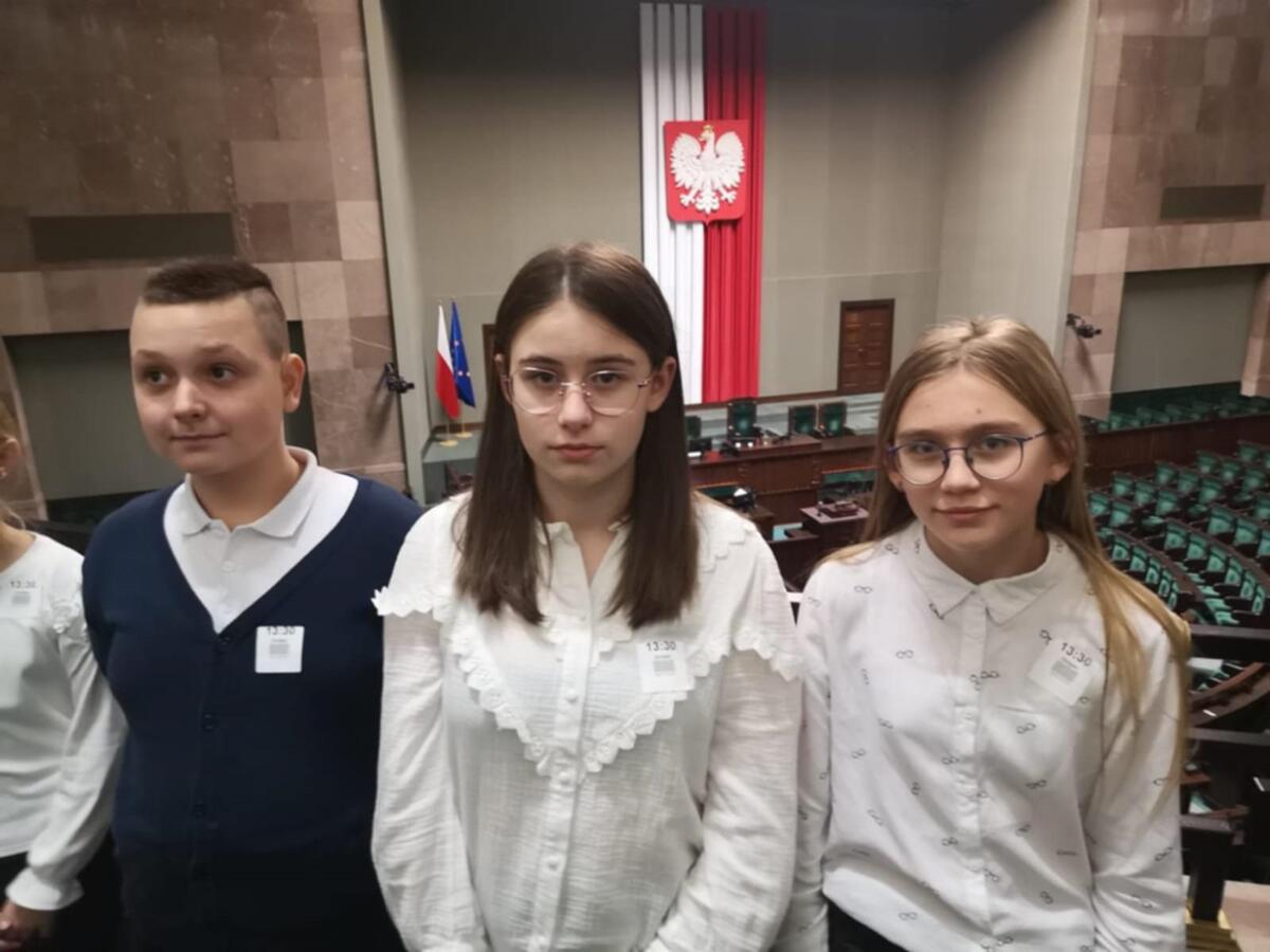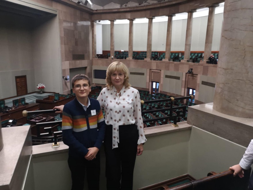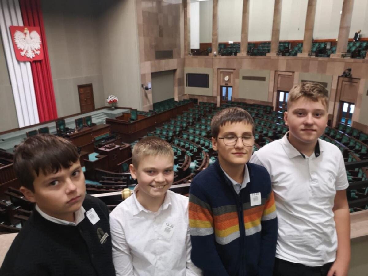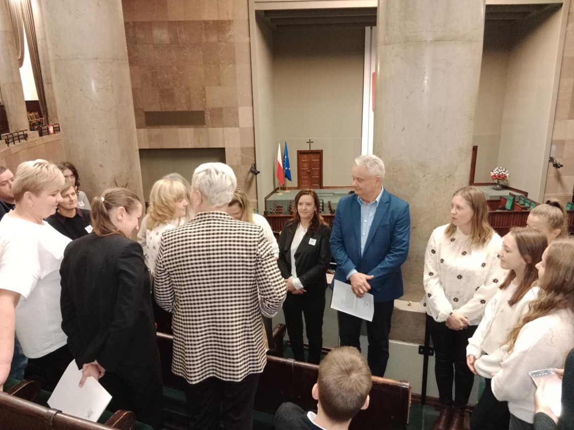 Następnie uczniowie udali się do Sejmu. Pani Przewodnicząca Rady Miejskiej, pani Irena Kręcisz zorganizowała spotkanie z Posłem na Sejm RP, panem Mirosławem Maliszewskim. Grupa zwiedziła salę sejmową, zapoznała się