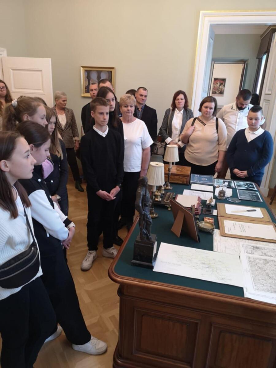 Była to nietypowa wycieczka, wspólnie z uczniami pojechali rodzice, radni i Pan Paweł Grabek, Burmistrz Miasta Józefów nad Wisłą. Grupa zwiedziła Belweder. Wejście do Belwederu umożliwił Minister Rolnictwa i Rozwoju Wsi, pan Jan Krzysztof Ardanowski. Pałac Belwederowski w Warszawie ma piękną historię. Zwiedziliśmy wnętrze pałacu i znajdujące się tam Muzeum Marszałka Józefa Piłsudskiego. Była to piękna lekcja historii utrwalająca czasy rozbiorów, czasy powstania listopadowego jak i początki II RP