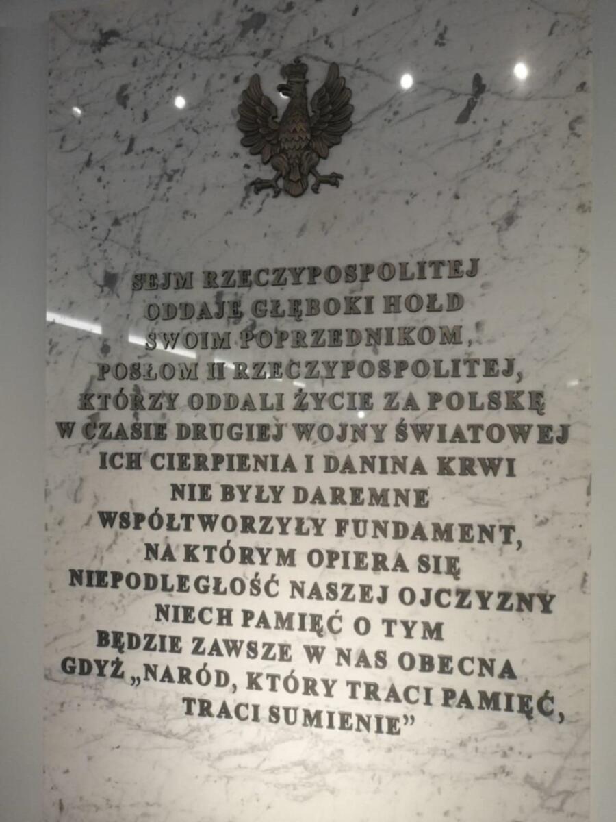 z informacjami zawartymi na tablicach pamiątkowych upamiętniających czasy II wojny światowej i katastrofę smoleńską. Pobyt w Sejmie to doskonała lekcja historii, parlamentaryzmu polskiego jak i patriotyzmu.