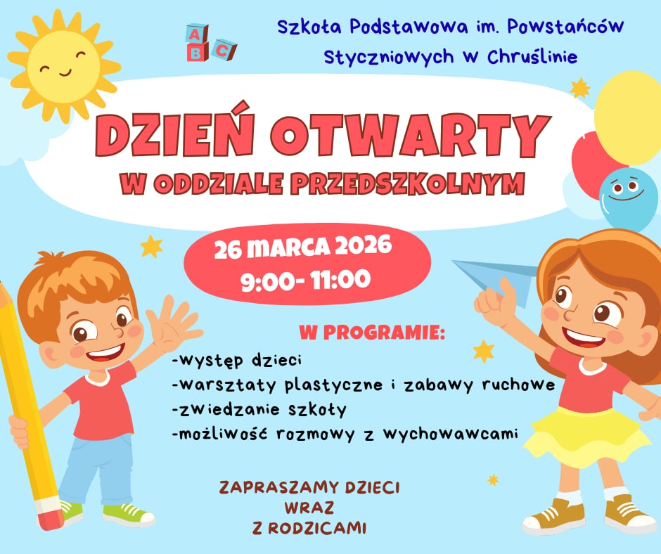 Dzień otwarty w Oddziale Przedszkolnym. 26 marca 2026, godz. 9.00 – 11.00 Zapraszamy dzieci wraz z rodzicami!